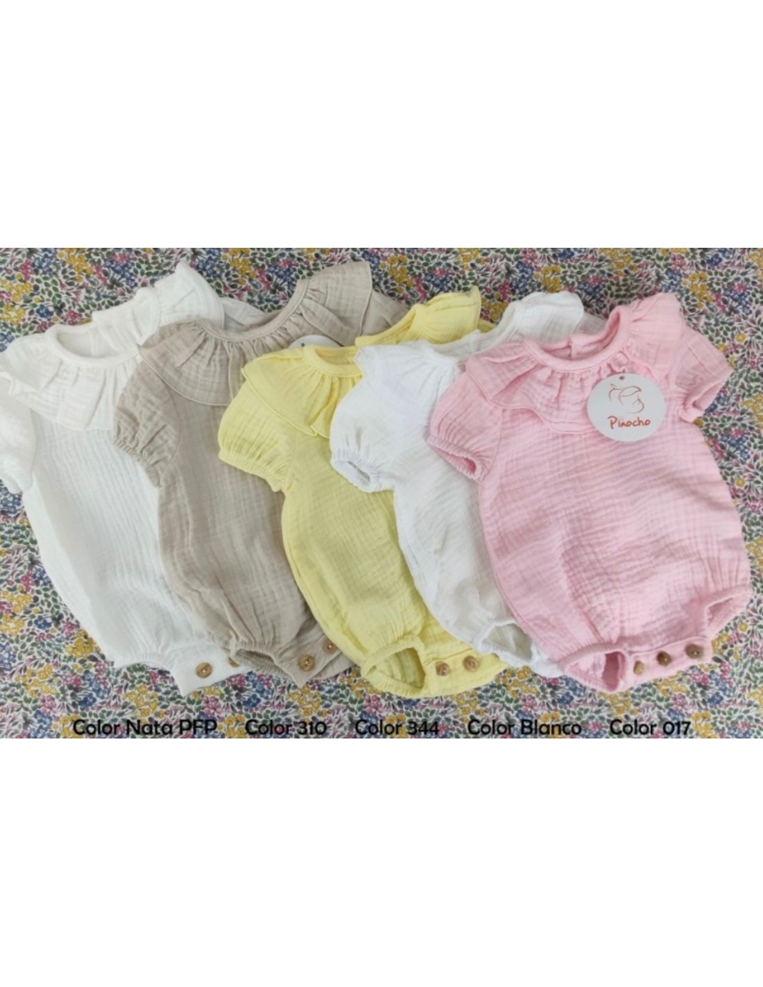 Pelele unisex con maxi cuello y fruncido en el pecho y botones de madera 100% algodón ( marca popys)