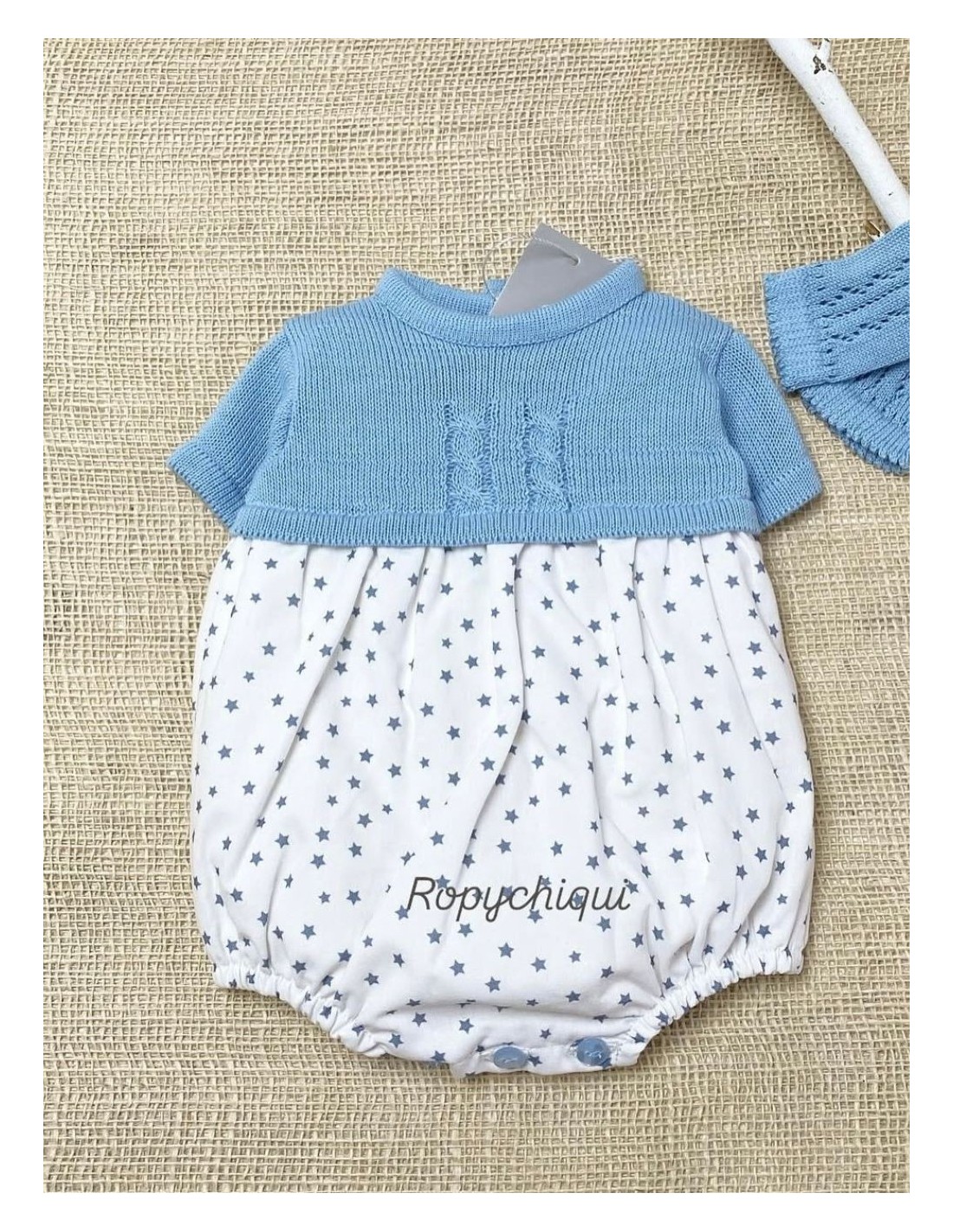 Pelele con pecho de hilo en dos colores y cuerpo de tela con estrellitas