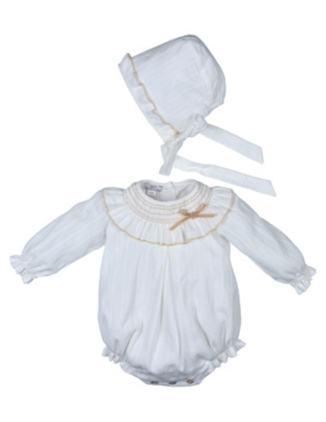 Pelele super colorido en tonos mostaza, camel y verde con lazo en el pecho