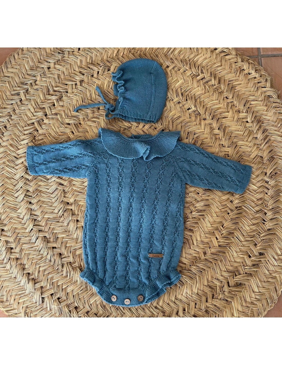 Conjunto lana 3 pieza con cuello blanco y botones de madera